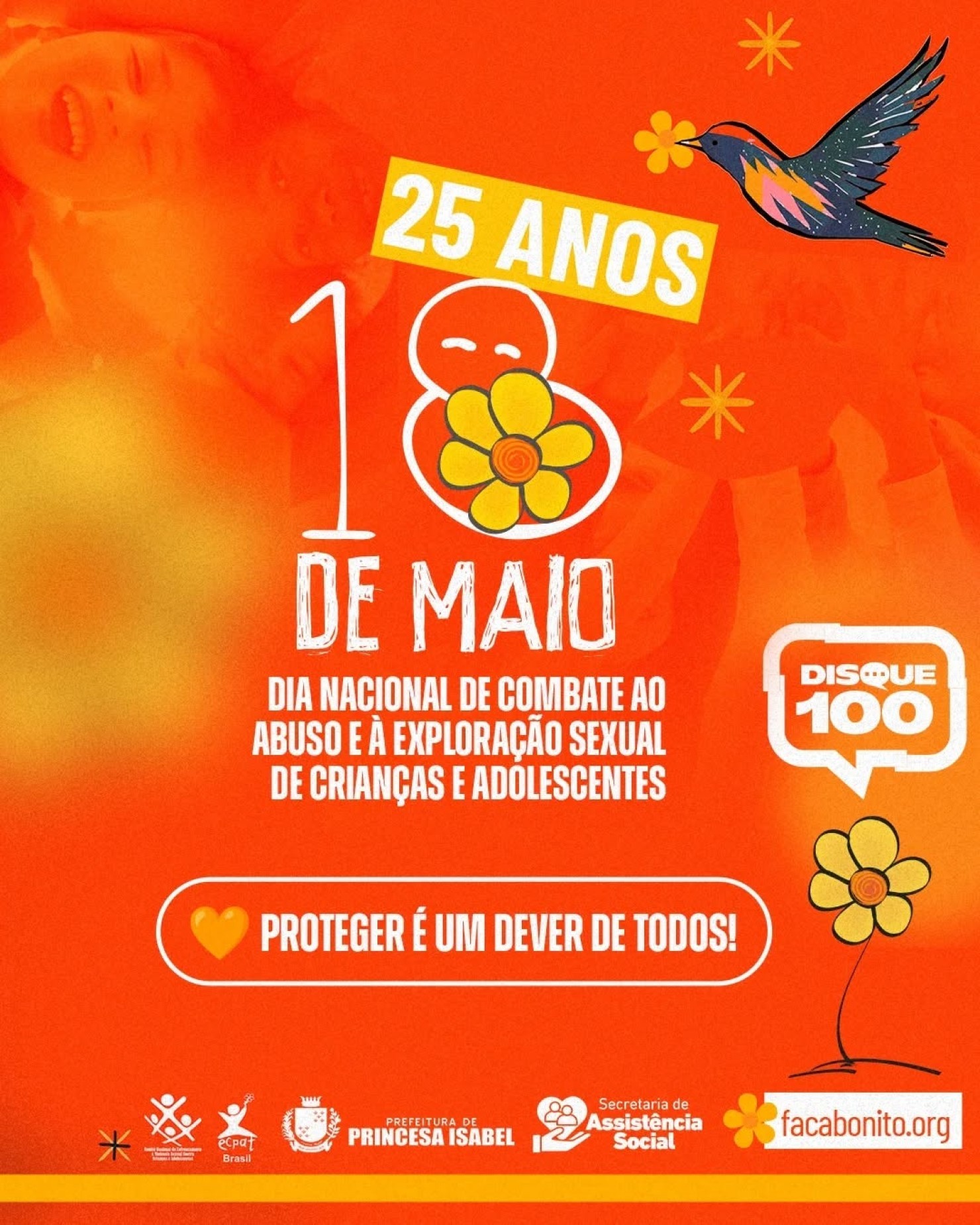 Neste Dia Nacional de Combate ao Abuso e à Exploração Sexual de Crianças e Adolescentes, o Governo Municipal de Princesa Isabel, por meio da Secretaria de Assistência Social e da Rede de Proteção, reafirma o seu compromisso com a defesa dos direitos da infância e adolescência, lutando contra todo e qualquer tipo de abuso e exploração.