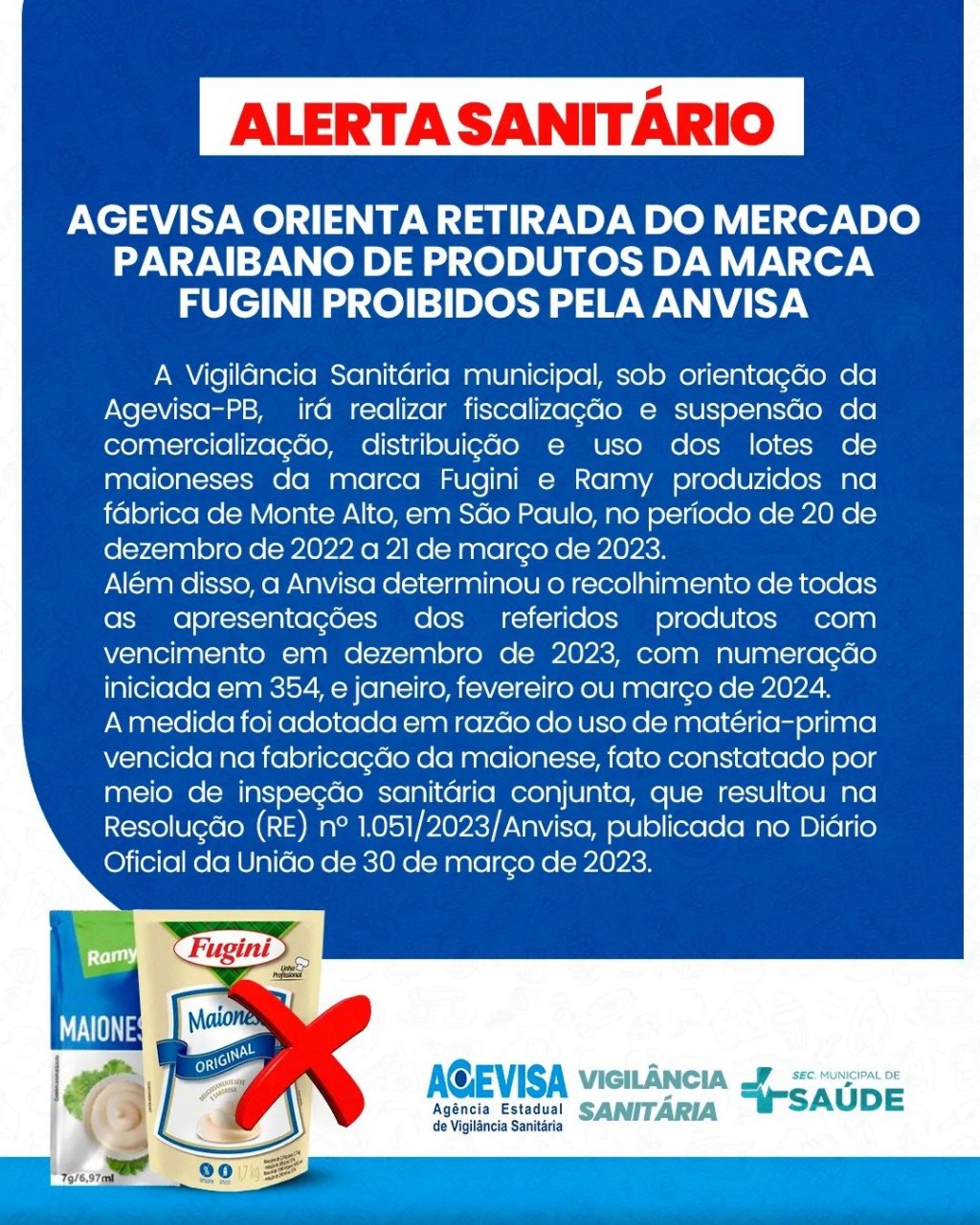 A Vigilância Sanitária municipal, sob orientação da Agevisa-PB, irá realizar fiscalização e suspensão da comercialização, distribuição e uso dos lotes de maioneses da marca Fugini e Ramy produzidos na fábrica de Monte Alto, em São Paulo, no período de 20 de dezembro de 2022 a 21 de março de 2023.