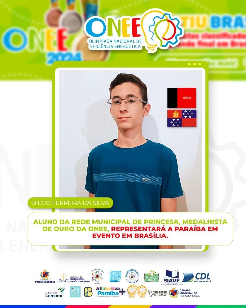 O aluno do 9º ano da Escola Municipal Carlos Alberto Medeiros Duarte Sobreira, Diego Ferreira da Silva, medalhista de ouro na edição 2024 da Olimpíada Nacional de Eficiência Energética, representará o estado da Paraíba em Brasília, em evento que envolve desafios, palestras e atividades práticas, incentivando a pesquisa e a criação de projetos que visem a economia de energia e o uso sustentável dos recursos. O objetivo é formar cidadãos mais conscientes sobre a importância da eficiência energética e estimular inovações na área.