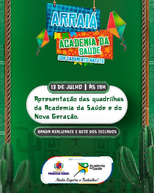 Convidamos toda a população princesense para prestigiar mais um Arraiá da Academia da Saúde. Será nesta quarta-feira, 13 de julho, a partir das 19h, na Praça Mirom Maia.