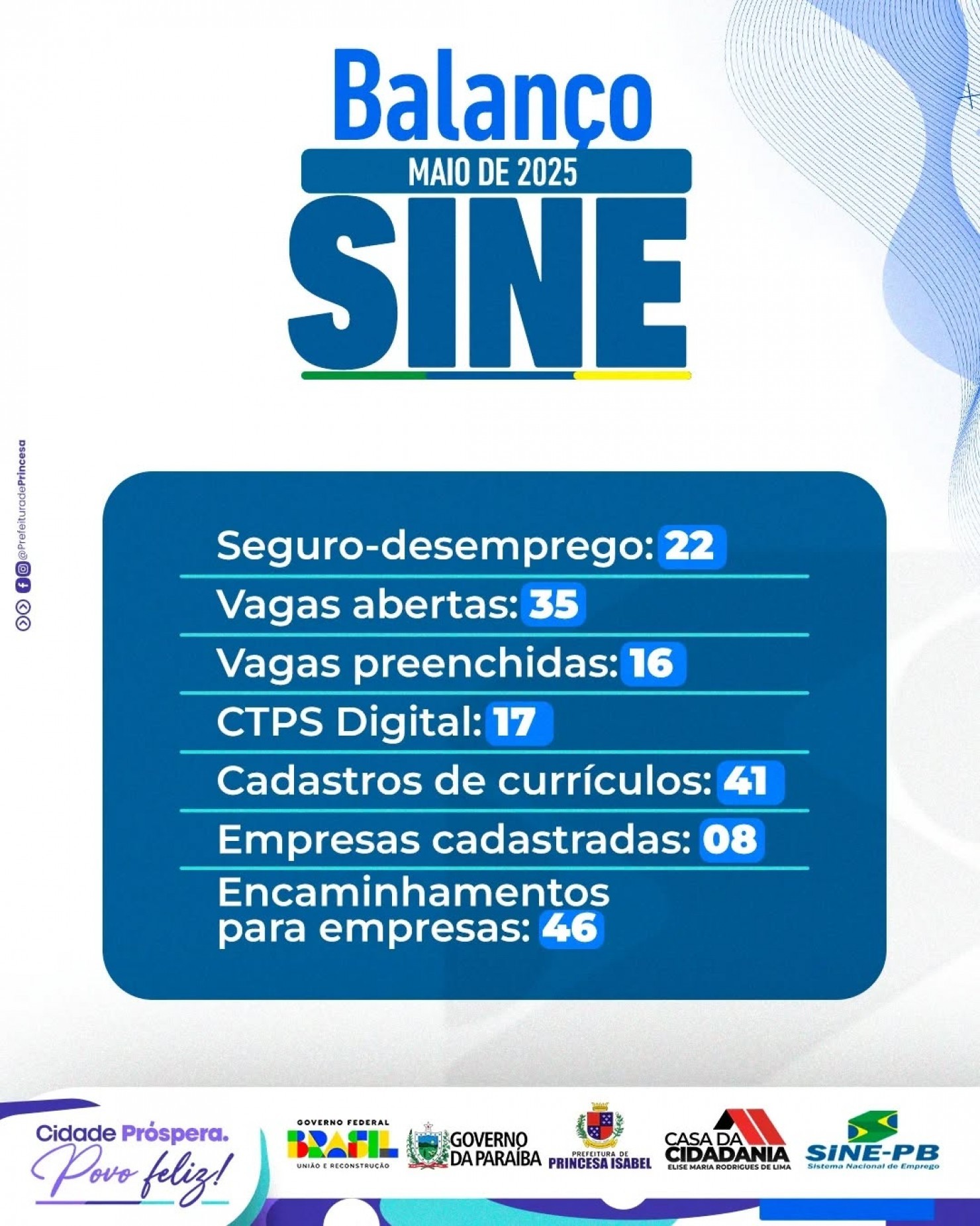 O Sistema Nacional de Emprego (SINE) segue contribuindo com a geração de oportunidades e o fortalecimento do mercado de trabalho local. Ao longo do mês de maio, diversos serviços foram ofertados à população, como emissão de carteira de trabalho digital, cadastro de currículos, intermediação de mão de obra e orientação para o trabalhador.