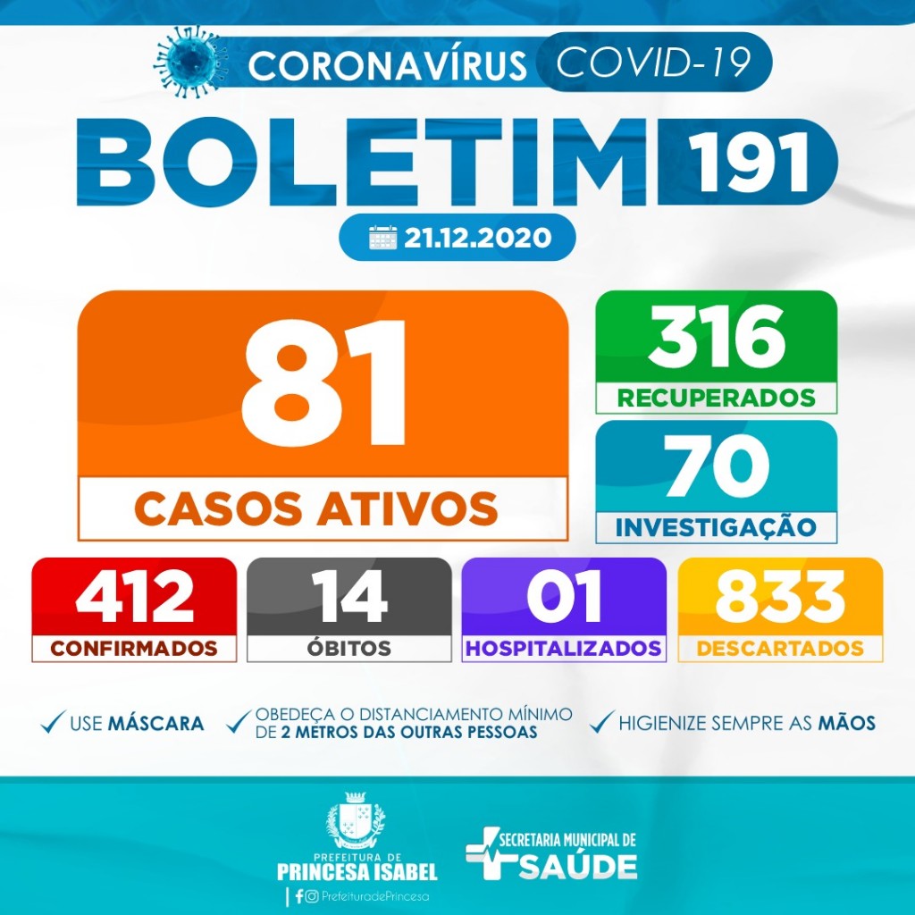 6. O uso de máscaras é obrigatório em todo o município de Princesa Isabel, conforme decreto editado e publicado na íntegra na página oficial do governo municipal e redes sociais da prefeitura.