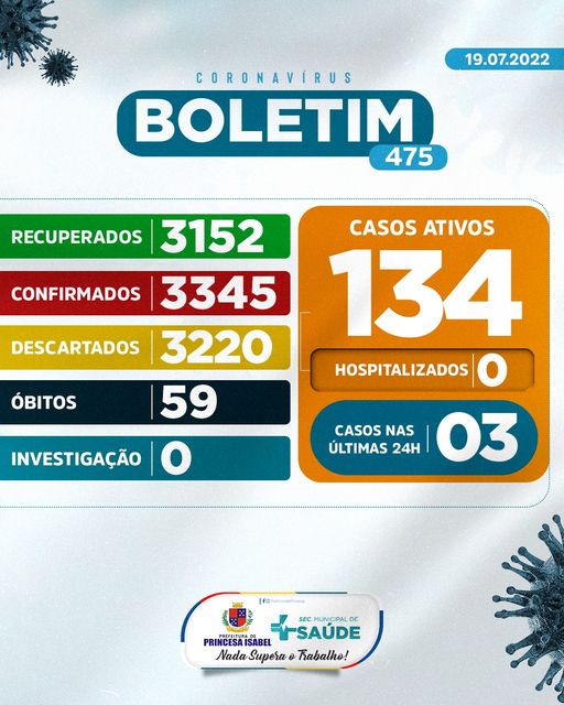 O Comitê Gestor da Crise COVID-19, em Princesa Isabel, informa: 1. Até o momento foram atendidos no Hospital Regional Deputado José Pereira Lima, UPA 24h e na Rede de Atenção Básica 6.565 pessoas suspeitas de infecção por COVID-19 (Coronavírus); desses, 3.220 foram descartados, 3.345 confirmados e nenhum caso está em investigação. Dos confirmados, nenhum está hospitalizado, 3.152 foram recuperados e 59 foram a óbito. 2. Todas as medidas utilizadas para atestar como casos suspeitos e casos descartados, seguem rigorosamente o que preconiza o Ministério da Saúde; 3. As determinações do Ministério da Saúde para achatar a curva epidemiológica da disseminação da COVID-19 e de suas variantes continuam massificadas; 4. As determinações contidas nos decretos municipais DEVEM ser cumpridas. Princesa Isabel, 19 de julho de 2022.