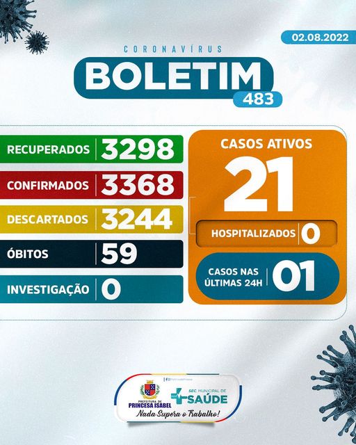 O Comitê Gestor da Crise COVID-19, em Princesa Isabel, informa: 1. Até o momento foram atendidos no Hospital Regional Deputado José Pereira Lima, UPA 24h e na Rede de Atenção Básica 6.612 pessoas suspeitas de infecção por COVID-19 (Coronavírus); desses, 3.244 foram descartados, 3.368 confirmados e nenhum caso está em investigação. Dos confirmados, nenhum está hospitalizado, 3.298 foram recuperados e 59 foram a óbito. 2. Todas as medidas utilizadas para atestar como casos suspeitos e casos descartados, seguem rigorosamente o que preconiza o Ministério da Saúde; 3. As determinações do Ministério da Saúde para achatar a curva epidemiológica da disseminação da COVID-19 e de suas variantes continuam massificadas; 4. As determinações contidas nos decretos municipais DEVEM ser cumpridas. Princesa Isabel, 02 de agosto de 2022.