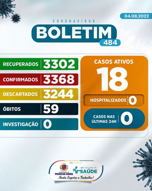 O Comitê Gestor da Crise COVID-19, em Princesa Isabel, informa: 1. Até o momento foram atendidos no Hospital Regional Deputado José Pereira Lima, UPA 24h e na Rede de Atenção Básica 6.612 pessoas suspeitas de infecção por COVID-19 (Coronavírus); desses, 3.244 foram descartados, 3.368 confirmados e nenhum caso está em investigação. Dos confirmados, nenhum está hospitalizado, 3.302 foram recuperados e 59 foram a óbito. 2. Todas as medidas utilizadas para atestar como casos suspeitos e casos descartados, seguem rigorosamente o que preconiza o Ministério da Saúde; 3. As determinações do Ministério da Saúde para achatar a curva epidemiológica da disseminação da COVID-19 e de suas variantes continuam massificadas; 4. As determinações contidas nos decretos municipais DEVEM ser cumpridas. Princesa Isabel, 04 de agosto de 2022.