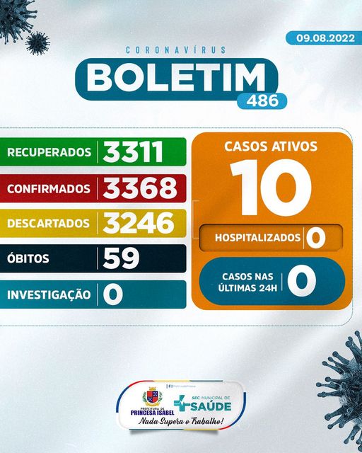 O Comitê Gestor da Crise COVID-19, em Princesa Isabel, informa: 1. Até o momento foram atendidos no Hospital Regional Deputado José Pereira Lima, UPA 24h e na Rede de Atenção Básica 6.614 pessoas suspeitas de infecção por COVID-19 (Coronavírus); desses, 3.246 foram descartados, 3.368 confirmados e nenhum caso está em investigação. Dos confirmados, nenhum está hospitalizado, 3.311 foram recuperados e 59 foram a óbito. 2. Todas as medidas utilizadas para atestar como casos suspeitos e casos descartados, seguem rigorosamente o que preconiza o Ministério da Saúde; 3. As determinações do Ministério da Saúde para achatar a curva epidemiológica da disseminação da COVID-19 e de suas variantes continuam massificadas; 4. As determinações contidas nos decretos municipais DEVEM ser cumpridas. Princesa Isabel, 09 de agosto de 2022.