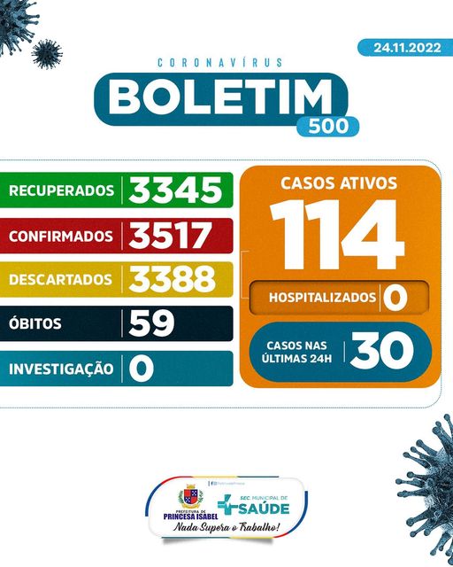 O Comitê Gestor da Crise COVID-19, em Princesa Isabel, informa: 1. Até o momento foram atendidos no Hospital Regional Deputado José Pereira Lima, UPA 24h e na Rede de Atenção Básica 6.905 pessoas suspeitas de infecção por COVID-19 (Coronavírus); desses, 3.388 foram descartados, 3.517 confirmados e nenhum caso está em investigação. Dos confirmados, nenhum está hospitalizado, 3.345 foram recuperados e 59 foram a óbito. 2. Todas as medidas utilizadas para atestar como casos suspeitos e casos descartados, seguem rigorosamente o que preconiza o Ministério da Saúde; 3. As determinações do Ministério da Saúde para achatar a curva epidemiológica da disseminação da COVID-19 e de suas variantes continuam massificadas; 4. As determinações contidas nos decretos municipais DEVEM ser cumpridas. Princesa Isabel, 24 de novembro de 2022.