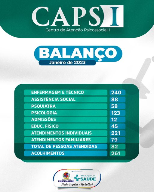 O Centro de Atenção Psicossocial tipo 1 (CAPS I) de Princesa realizou, somente no mês de janeiro, o total de 554 atendimentos. Desses, foram 240 em enfermagem e/ou técnico, 88 em assistência social, 123 em Psicologia, 45 em educação física e 58 em psiquiatria. Os atendimentos foram realizados com 82 usuários, dos quais 12 iniciaram o acompanhamento no serviço durante esse mês.
