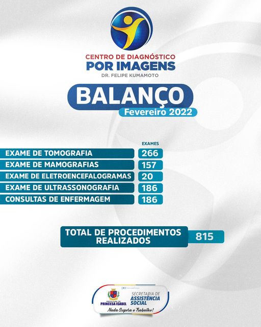 O Centro de Diagnóstico por Imagem Dr. Felipe Kumamoto realizou, durante o mês de fevereiro de 2022, 815 procedimentos. Desses, foram 266 tomografias, 157 mamografias, 20 eletroencefalogramas, 186 ultrassonografias e 186 consultas de enfermagem.