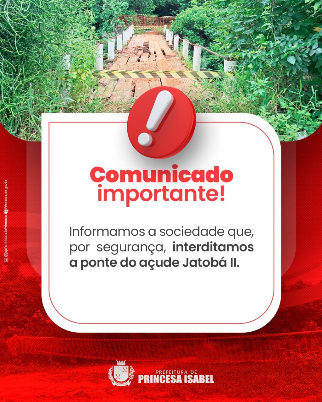 Informamos a sociedade que, por segurança, interditamos a ponte do açude Jatobá II.