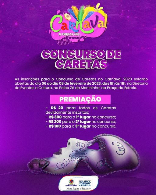 As inscrições para o Concurso de Caretas no Carnaval 2023 estarão abertas do dia 06 ao dia 08 de fevereiro de 2023, das 8h às 11h, na Diretoria de Eventos e Cultura, no Palco Zé de Menininha, na Praça da Estrela. No ato de inscrição é preciso apresentar documento de identificação com foto. No caso de menor de idade, a inscrição deve ser realizada pelo responsável maior de idade. Os inscritos serão identificados com número na parte posterior da fantasia durante as apresentações nos dias de Carnaval em Princesa Isabel. O concurso acontecerá no dia 19 de fevereiro, domingo de Carnaval, as 15:00h, no Palco.