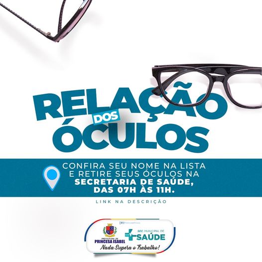 Confira seu nome na lista e retire seus óculos na sede da Secretaria Municipal de Saúde, de segunda a sexta-feira, das 07h às 11h.