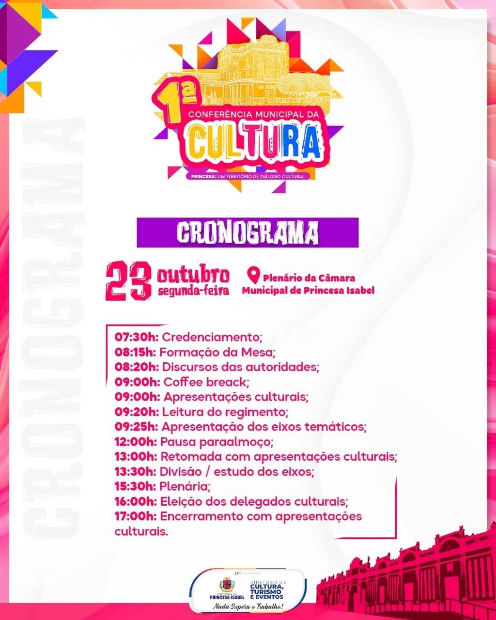 Na próxima segunda-feira (23) acontece em Princesa Isabel a I Conferência Municipal de Cultura. O evento acontecerá na Câmara Municipal a partir das 7:30h. Você pode se inscrever através do link abaixo.