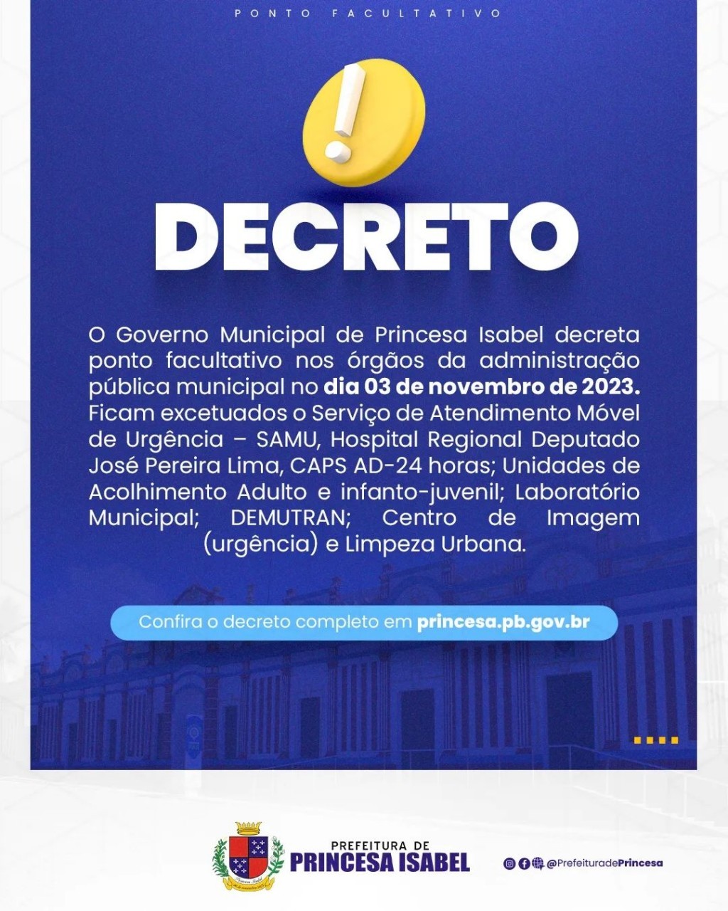 O Governo Municipal de Princesa Isabel decreta ponto facultativo nos órgãos da administração pública municipal no dia 03 de novembro de 2023.