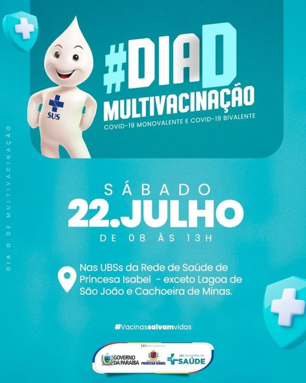 A Secretaria Municipal de Saúde realiza, no próximo sábado (22), mais um Dia D de Multivacinação. Se você, ou alguém em sua casa, tem alguma vacina atrasada, seja contra a COVID (mono e/ou bivalente) ou qualquer vacina de rotina, compareça a umas das UBSs da cidade e atualize a caderneta.
