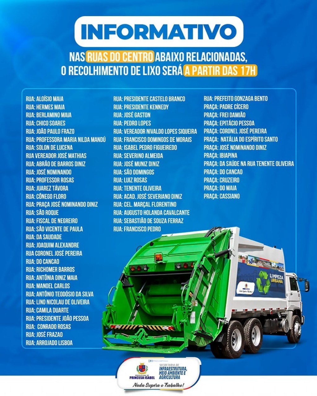 O recolhimento de lixo nas ruas listadas neste card acontecerá somente após às 17h. Assim, orientamos a colocarem o lixo para recolhimento somente no horário especificado.