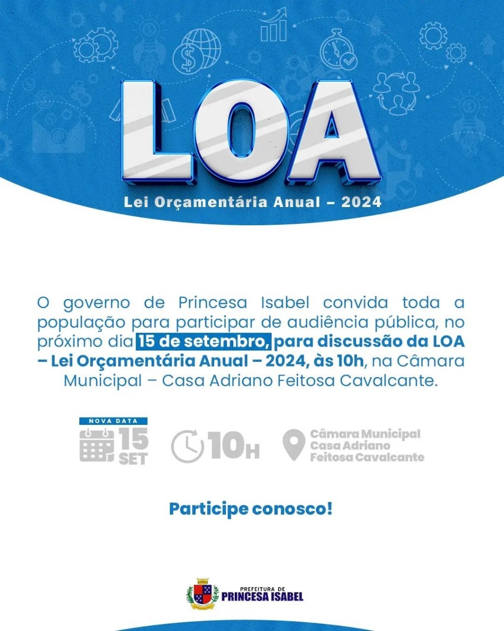 A LOA, Lei Orçamentária Anual, é uma ferramenta que estipula todas as receitas e, consequentemente, todas as despesas do município para o próximo ano. Para garantir total responsabilidade e transparência, convidamos você para participar conosco de audiência pública, no próximo dia 15 de setembro, às 10h, no auditório da Casa Adriano Feitosa Cavalcante.