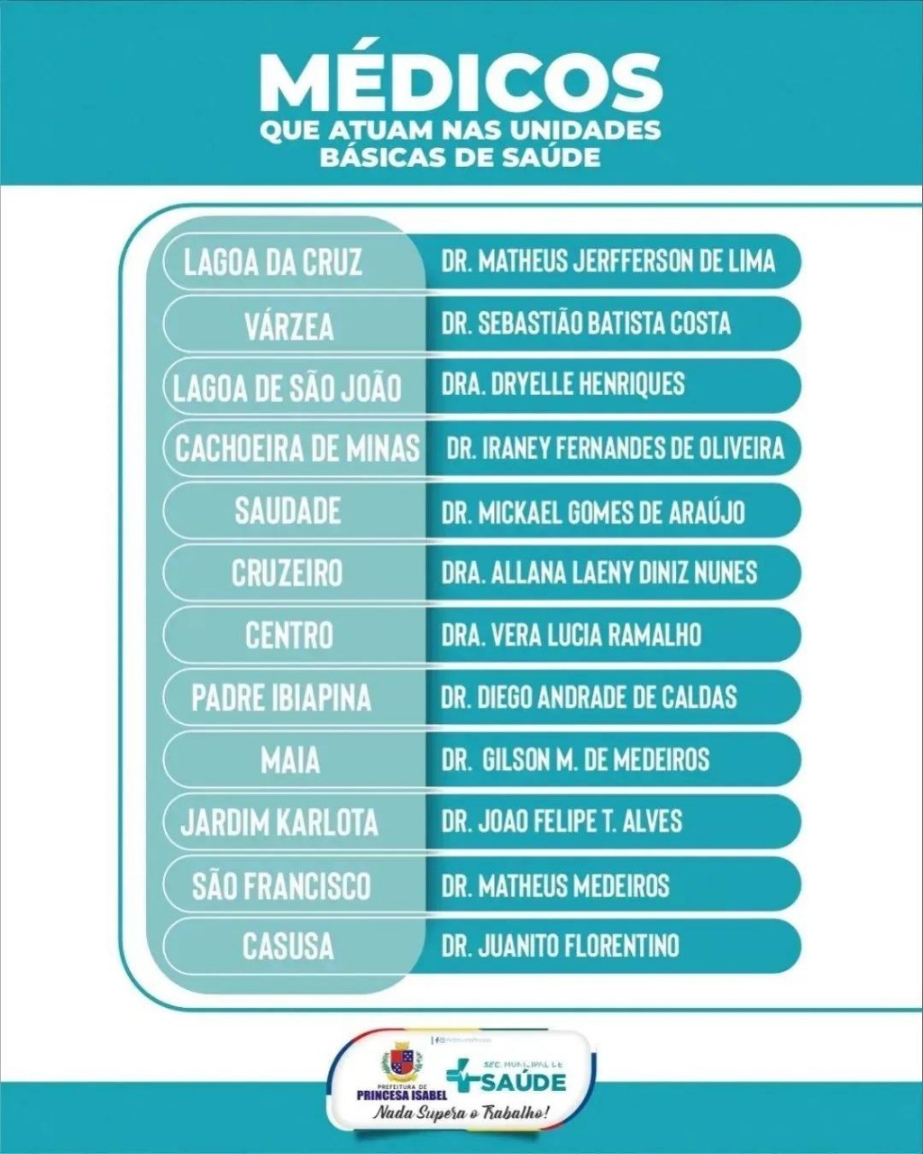 Temos 12 Unidades Básicas de Saúde, todas elas com atendimento médico e multiprofissional. Confira os médicos que atuam em cada uma delas!