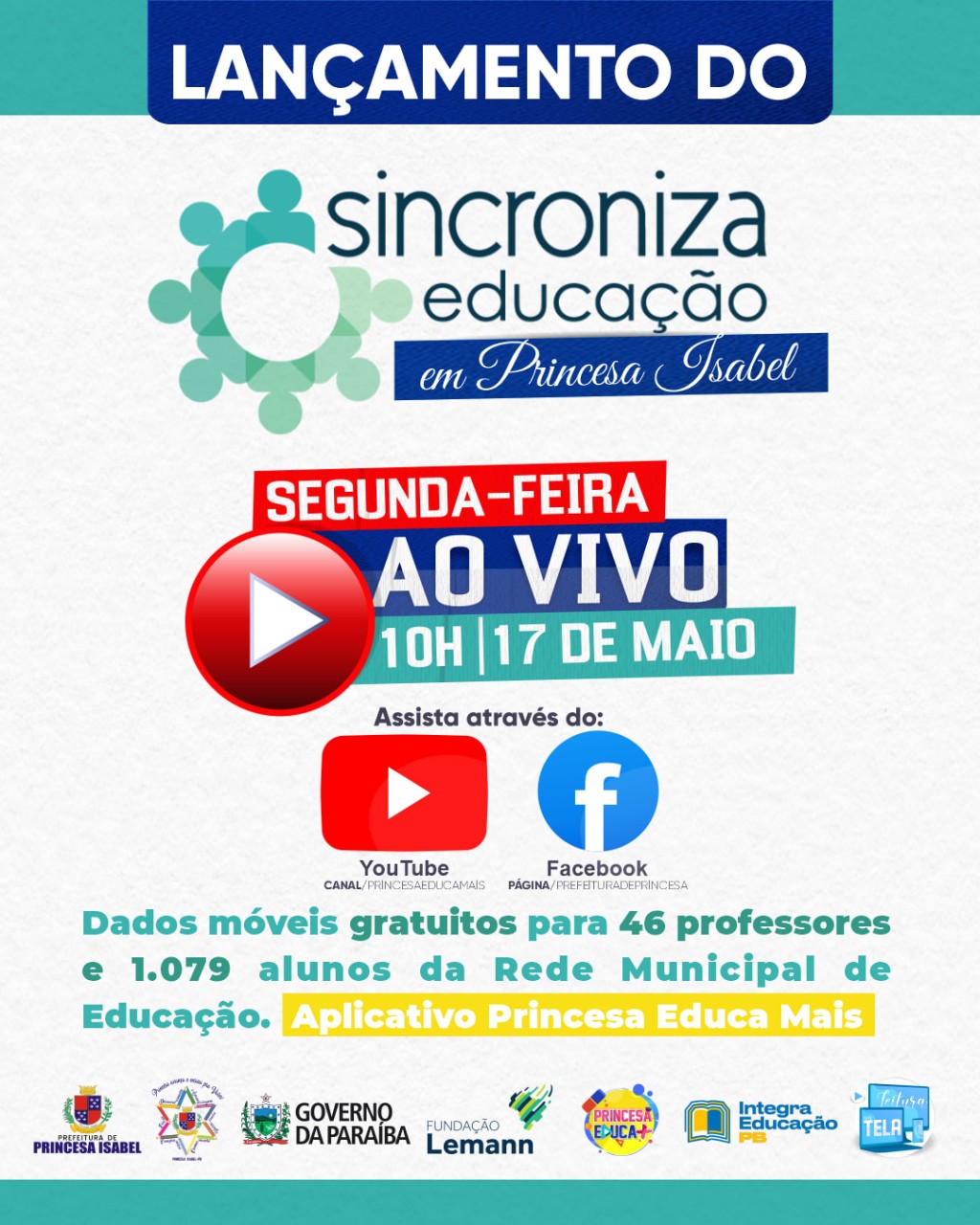 O lançamento do Sincroniza Educação em Princesa Isabel será na próxima segunda-feira, 17 de maio, às 10h, na página da Prefeitura de Princesa Isabel e no canal Princesa Educa Mais, no YouTube!