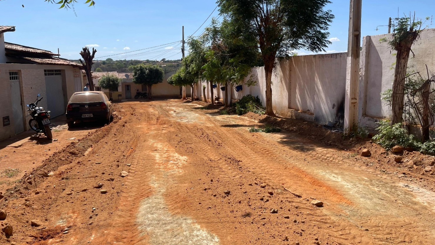 O local está recebendo o serviço de terraplanagem, etapa essencial para a tão aguardada pavimentação em paralelepípedos.