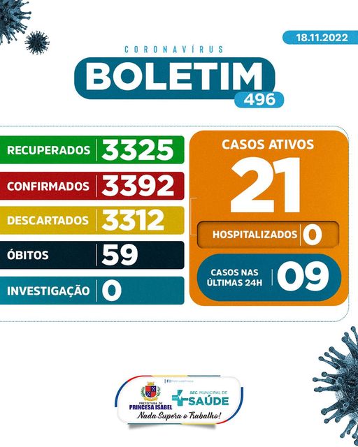 O Comitê Gestor da Crise COVID-19, em Princesa Isabel, informa: 1. Até o momento foram atendidos no Hospital Regional Deputado José Pereira Lima, UPA 24h e na Rede de Atenção Básica 6.704 pessoas suspeitas de infecção por COVID-19 (Coronavírus); desses, 3.312 foram descartados, 3.392 confirmados e nenhum caso está em investigação. Dos confirmados, nenhum está hospitalizado, 3.325 foram recuperados e 59 foram a óbito. 2. Todas as medidas utilizadas para atestar como casos suspeitos e casos descartados, seguem rigorosamente o que preconiza o Ministério da Saúde; 3. As determinações do Ministério da Saúde para achatar a curva epidemiológica da disseminação da COVID-19 e de suas variantes continuam massificadas; 4. As determinações contidas nos decretos municipais DEVEM ser cumpridas. Princesa Isabel, 18 de novembro de 2022.