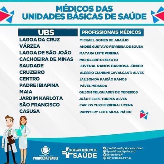 Estamos com 100% de cobertura médica nas nossas Unidades Básicas de Saúde. São 12 UBS’s, distribuídas pelos bairros da cidade, além de 10 Postos âncoras de Saúde na zona rural. Confira os profissionais médicos que atuam em cada Unidade!