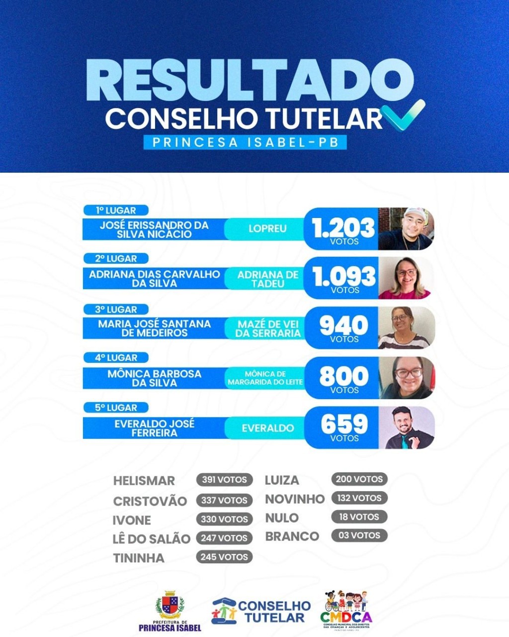 Resultado oficial das eleições para o Conselho Tutelar (biênio 2024-2027).