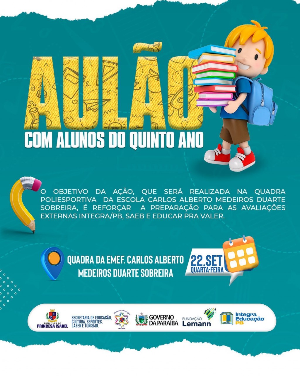 O objetivo da ação, que será realizada na quadra poliesportiva da escola Carlos Alberto Medeiros Duarte sobreira, é reforçar a preparação para as avaliações externas INTEGRA/PB, SAEB E EDUCAR PRA VALER.
