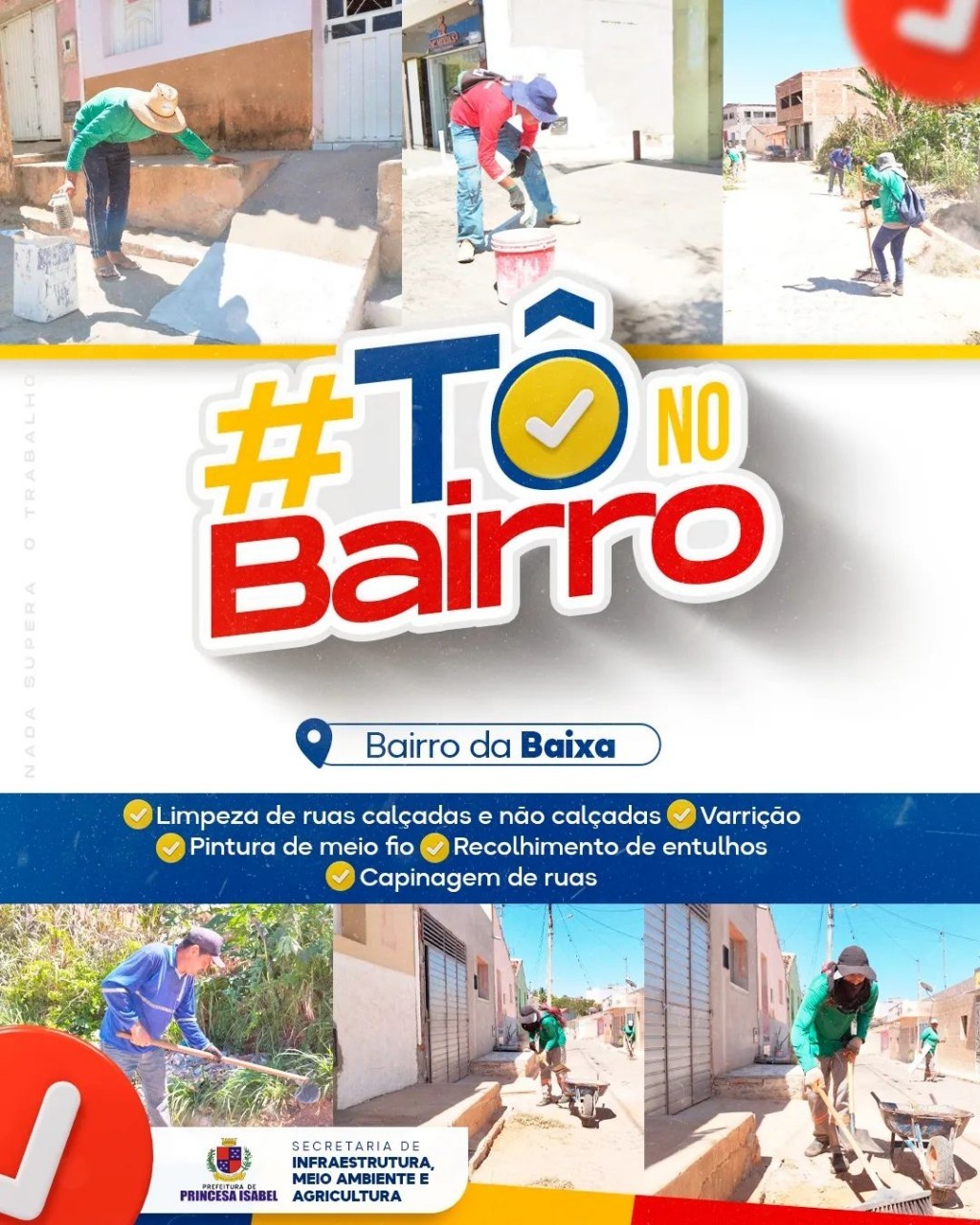 O #tônobairro de hoje foi no bairro da Baixa. Realizamos reparos e melhorias, limpeza e capinagem nas ruas, recolhimento de entulhos, pintura de meio-fio e muito mais.