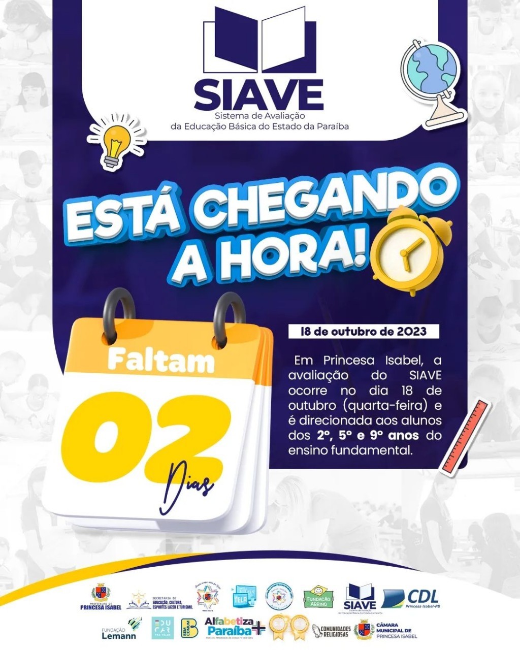 Em Princesa Isabel, a avaliação do SIAVE ocorre no dia 18 de outubro (quarta-feira) e é direcionada aos alunos dos 2º, 5º e 9º anos do ensino fundamental. A Secretaria de Educação, Cultura, Esportes, Lazer e Turismo está empenhada em oferecer simulados e todo o suporte estrutural e pedagógico necessário aos alunos da rede, a fim de ajudá-los a se prepararem para a avaliação e a melhorar seu desempenho nas disciplinas avaliadas.