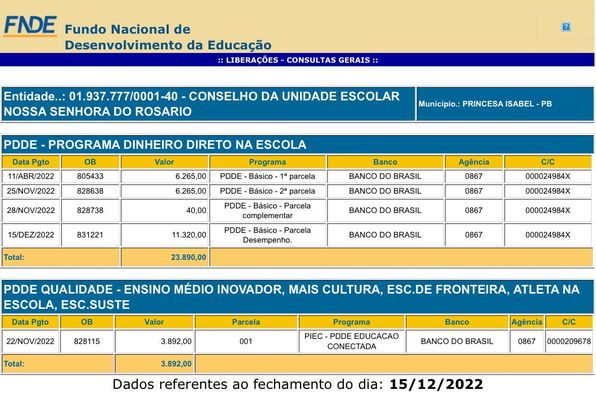 As escolas municipais Carlos Alberto Medeiros Duarte Sobreira e Nossa Senhora do Rosário foram premiadas pelo desempenho por gestão descentralizada do PDDE – Programa Dinheiro Direto na Escola, com um valor de quase 26.600 reais. O prêmio se deu em razão da excelência no desempenho da gestão dos programas e recursos repassados e na prestação de contas dos mesmos.