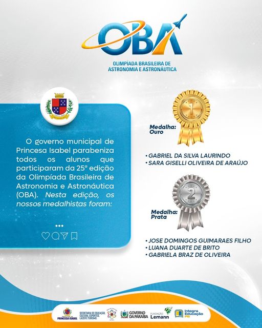 Os nossos parabéns a todos os alunos princesenses que participaram da Olimpíada Brasileira de Astronomia e Astronáutica, assim como aos professores que os acompanham. Que vocês sigam acreditando que a educação é a nossa principal arma na luta por uma sociedade cada vez mais justa.