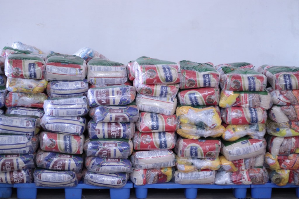 Cada cesta era composta por 2kg de feijão, 2kg de açúcar, 4 pacotes de macarrão, 2kg de leite em pó, 1 garrafa de óleo e 5kg de arroz.