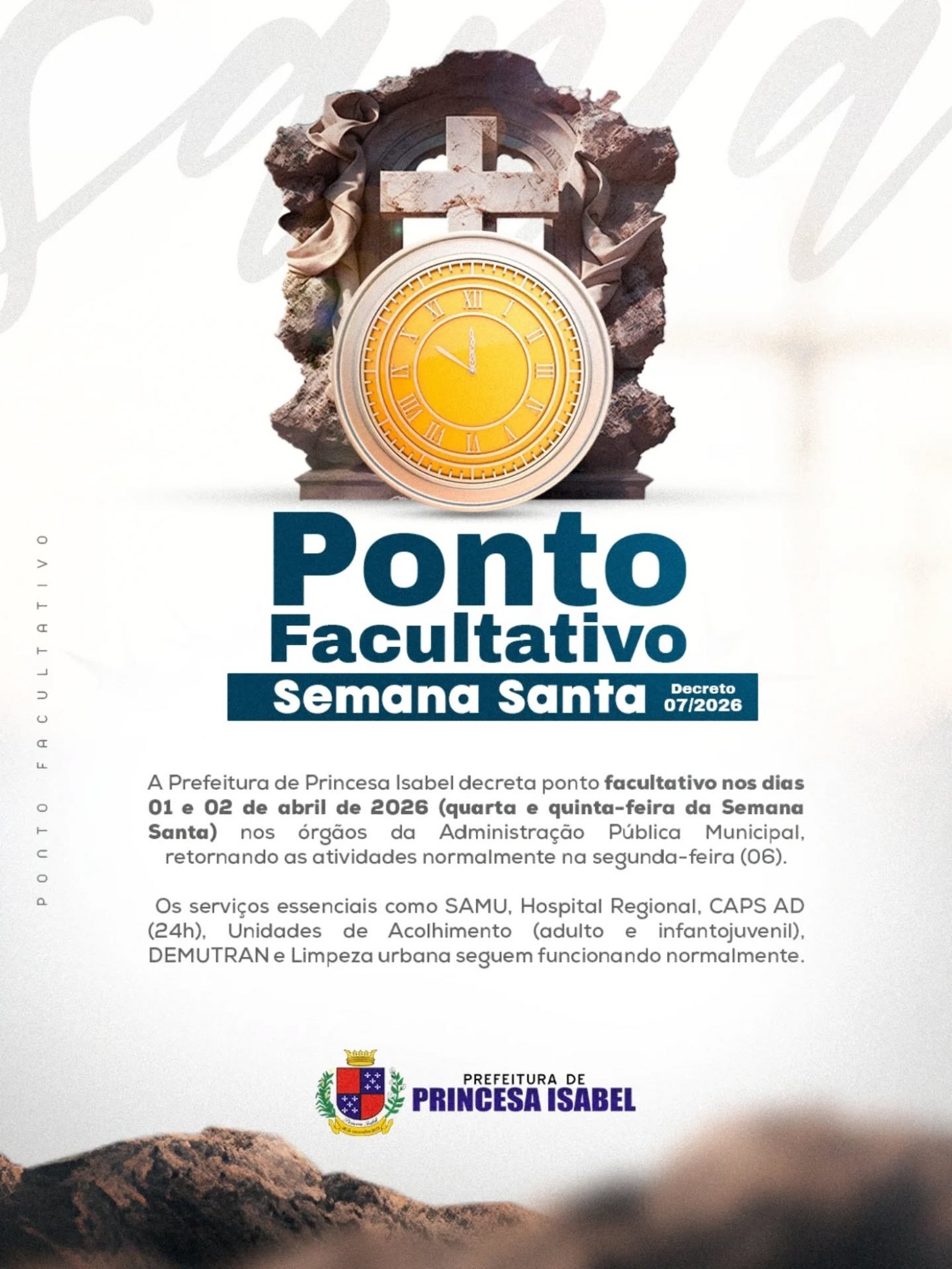A Prefeitura de Princesa Isabel informa à população que foi decretado ponto facultativo nos dias 01 e 02 de abril de 2026 (quarta e quinta-feira da Semana Santa), conforme o Decreto nº 07/2026.