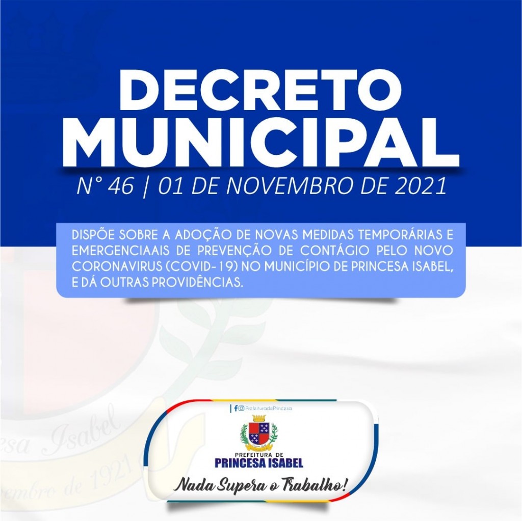 O governo Municipal de Princesa Isabel publicou novo decreto prorrogando as medidas de proteção e segurança contra a COVID-19 até 30 de novembro.