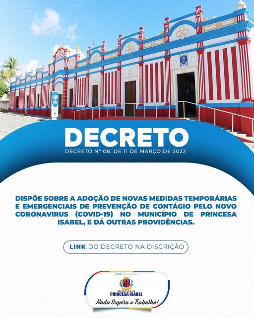O governo municipal de Princesa Isabel publicou, nesta sexta-feira (11), o Decreto Municipal 08/2022, com novas medidas temporárias e emergenciais de prevenção à COVID-19.