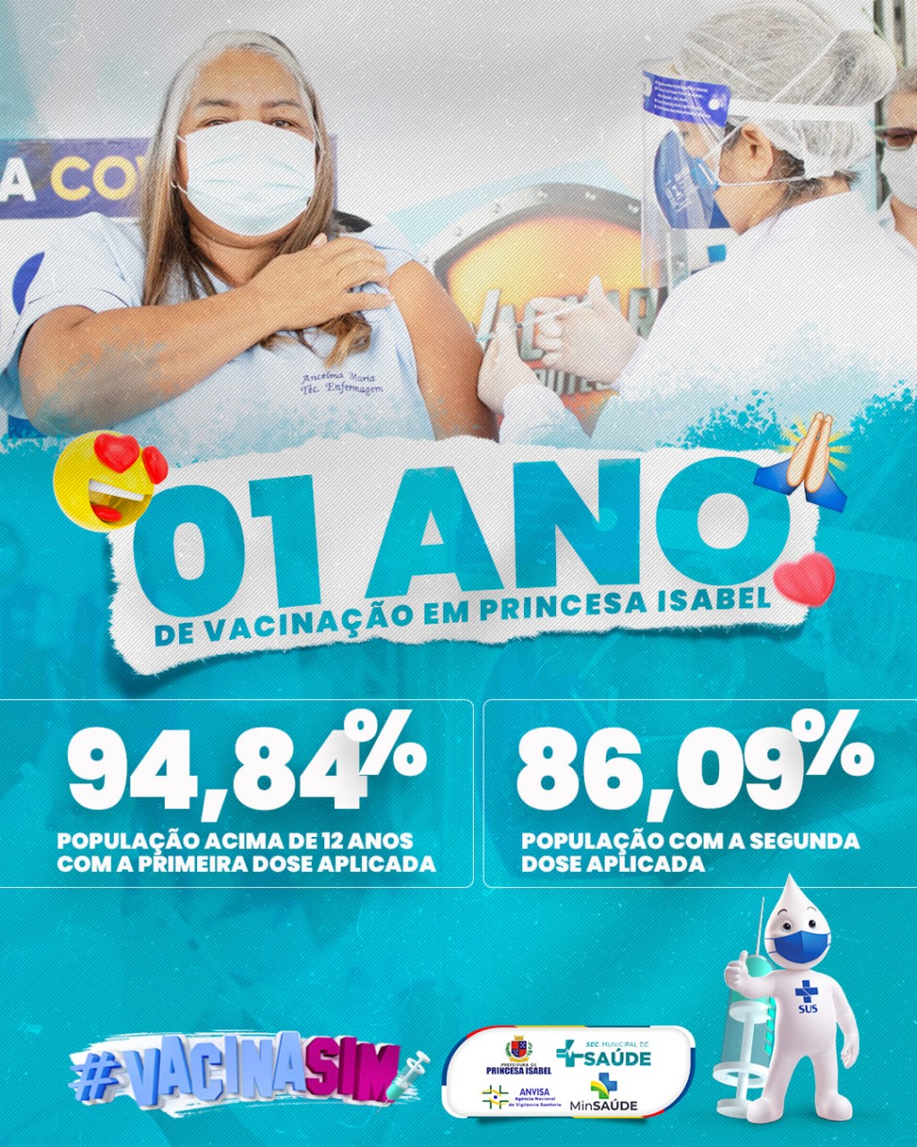 Hoje, 19 de janeiro de 2022, o município de Princesa Isabel completa 1 ano do início da vacinação contra a COVID-19. Ao longo desse ano as equipes se mobilizaram, de maneira intensiva e ininterrupta, para oferecer segurança e esperança a toda população, realizando ações imediatas, com grande estrutura e organização, com o intuito de alcançar sempre o maior número de pessoas possível e frear a disseminação do novo corona vírus.